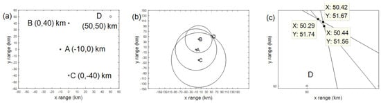 As demonstrated by the the above results, the ASR errors at three receivers are all within 2%, achieving high-precision ranging. Next, according to the geometric relation, we drew three circles with the points A, B, and C as the center and ,, as the radius, respectively, to determine the acoustic source position, as shown in Figure 7b.