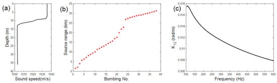The SSP measured in the experiment is shown in Figure 8a. The sea depth is H = 36 m, and the 32-element vertical array was used to receive data. Among the elements, three were faulty and 29 were effective. The effective receiving depth zr = 2.5:1:30.5 m, the acoustic source depth zs = 16.5 m, and 38 explosion acoustic source tests were performed in the experiment. The 38 distances from acoustic sources to the receiver are shown in Figure 8b. The bottom geometry parameters were not measured in the experiment. According to the results in Reference [32], supposing the bottom is half infinite space and liquid seabed, the bottom sound speed cb = 1588 m/s, bottom density , and bottom longitudinal wave attenuation coefficient is fitted base on the results in Reference [31]: , where the unit of frequency f is Hz, the unit of is , and is the wavelength of the sound wave. Combined with the normal mode method, the corresponding eigenvalue and eigenfunction are calculated, and the needed sound wave frequency band is determined according to the actual calculation requirements. The calculated combined with the test environment is shown in Figure 8c.