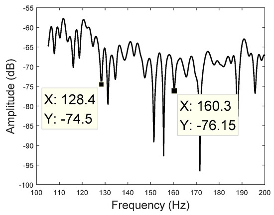 The normal mode method is used to obtain the eigenvalue and eigenfunction, and then, combined with the sound field interference frequency periodicity method, the acoustic source range is estimated. According to the KRAKEN program [33] and the environment in Figure 8a, only two propagating normal modes are obtained when the sound wave frequency f = 105:0.1:175 Hz. The sound field interference structure is simple, which is convenient for subsequent processing. Therefore, this frequency band is selected for ASR. The received signal spectrum is used to realize ASR. To obtain high-precision results, mode filtering [30] is performed on to obtain received spectrum and of the first two normal modes, and the filtered received signal spectrum is as follows: