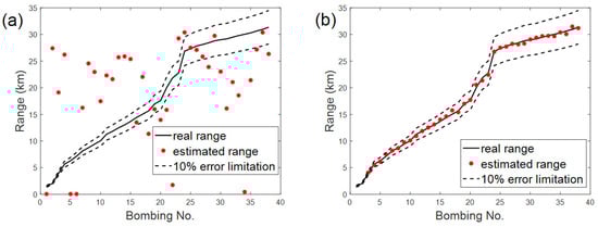 In addition, there are only 36 estimated distance points in Figure 10b, and the estimated distances of explosion locations No.1 and No.2 do not appear. The reason for this is that the actual acoustic source ranges of the two explosion locations are 1.496 and 2.071 km, respectively, which are too close for the proposed method, causing ASR to fail, and they are not marked in the Figure 10b.