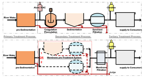 River water is a dispersion of inorganic and organic dissolved and colloidal matter, with various characteristics and components (salts, sugars, humic acids, etc.), micro-organisms (bacteria, algae, microbes, etc.), and solids (clay, sand, silicon, etc.) [3]. Rivers and lakes are convenient and reliable surface-water sources because low-cost treatment techniques are required before water is safely used for municipal or industrial uses. Among others, one of the major problems during the treatment of surface water is the high seasonal variation of turbidity [4]. Intensive rainfall may suddenly increase the degree of river-water turbidities, much greater than 300 or even 1000 NTU (Nephelometric Turbidity Units), posing a problem for any type of treatment technology [5,6]. The usual sequence of rapid water-treatment processes includes coagulation, flocculation, sedimentation, filtration, and finally disinfection [4,7]. The appropriate water-treatment method depends on the raw water characteristics: composition, suspended particle zeta potential and size distribution, water viscosity and density, etc. [8,9,10,11,12].