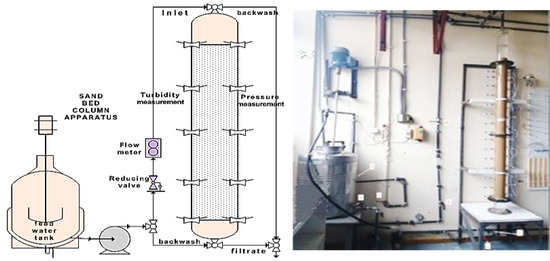The deep-bed filtration apparatus used for the experiments was consisted of a sand filter, a pressure measurement panel, a reservoir (0.1 m3) containing the suspension and a piping network (Figure 2). A centrifugal pump was driving water from the reservoir to the filter. All connections were made of PVC and a valve allowed flow direction control from top to bottom (for normal filtration operation) or from bottom to top (for fluidized bed operation and flushing). The flow rate gauge showed flow rates up to 0.1 m3 h−1. Filter was made of a Plexiglas cylindrical column of 90 mm internal diameter and was consisted of three parts: A 18 cm inlet which allowed water distribution in the sand bed, the sand bed with length equal to 171.5 cm and an outlet system of 13.5 cm of length, which retained the sand grains. The manometer panel was used for pressure difference measurements along the column and consisted of 9 Hg manometers made of glass with internal diameter 3 mm. During all the experiments, the suspensions flowed from top to bottom, a sample collected directly from the reservoir for turbidity measurement, and pressure-drop measurements were recorded at the sampling points. Samples were collected along the filter tube for turbidity, and particle concentration and particle size distribution measurements.