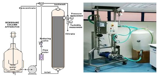 The HAR P1960 (Hydro Air Research-Italy) ultrafiltration membrane unit used for the experiments operated at a crossflow model (Figure 3). Ultrafiltration membranes operation is controlled by size exclusion mechanism. River water for municipal consumption is usually characterized by high initial turbidity values, membranes with pore openings up to 100 nm can be used to ensure lower values of fouling index and Trans Membrane Pressure (TMP). This kind of membranes guarantee higher rejection yields of the undesirable water components (suspended particles and almost all micro-organisms) which can be achieved by varying operating conditions, such as the tangential and the crossflow rates [32]. The membrane unit was consisted of stainless-steel piping, the removable membrane module, a thermometer, two manometers at the inlet and at the outlet of the membrane module and the corresponding flow control valves (Figure 3). The ultrafiltration membrane was ceramic, made of zirconia with pore sizes at 100 nm and active surface equal to 0.24 m2. It was equipped with 19 feeding channels of 1020 cm length and 4 mm of diameter. The absolute water permeability was estimated equal to 1800 L h−1 m−2, for flow rates equal to 3.44 and 4.30 m3 h−1, corresponding tangential flow velocities 4 and 5 m s−1 respectively, and transmembrane pressure (TMP) equal to 1.75 bar. From a reservoir of 200 L, the suspensions of kaolinite were introduced into the ultrafiltration module through suitable plastic piping and a centrifugal pump. Two separate outlets of the membrane unit gave the filtrate (permeate) and the retentate (concentrate) which ended at the initial tank During the experiment, samples of the permeate and the concentrate were collected for turbidity, particle size distribution and particle concentration measurements.