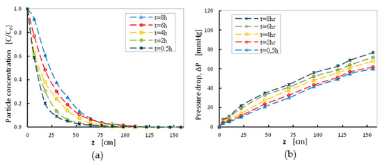 Data for particle concentration at the outlet of the filter and the pressure-drop values at different depths were collected at different time intervals (0, 0.5, 2, 4, 6, and 8 h). For all filtration durations, normalized particle concentration at the outlet of the filter, was reduced along the filter depth with different rates (Figure 4a), as expected. The normalized particle concentration at the outlet for the same depth increased with time, showing that the filtration efficiency of the packing material is reduced gradually with time and local interstitial velocity increased considerably due to particles deposits on grain surfaces. Particle deposition resulted in permeability decrease, thus since flowrate was kept constant, the corresponding curves of pressure-drop were shifted correspondingly (Figure 4b). After eight-hour of filtration, particle concentration in the bulk flow within the filter was significant for sand-bed depths up to 50 cm (Figure 4a) and particle deposition took place at depths lower than 100 cm. Measured pressure-drop values were lower than 80 mmHg (~0.1 bar), at the outlet of the filter z = 150 cm, which was acceptable for filter operation (Figure 4b). Figure 4b shows the optimal conditions for filtration, in terms of the optimum depth before backwashing is employed to refresh the filter capacity.
