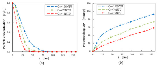 The effect of initial turbidity value was tested at 15, 70, and 150 NTU, at a moderate filtration rate, with superficial velocity equal to V = 1.85 mm s−1, after 8 h of the initiation of the filtration process. The tested turbidity values represent turbidity of Glafkos River raw water that feed the local municipal drinking water plant, all over the year. As expected, higher values of suspension normalized concentration and pressure-drop values were obtained at different depths, for higher initial turbidity values (Figure 5). Filter efficiency decreased, and pressure-drop values increased at higher initial turbidity values.