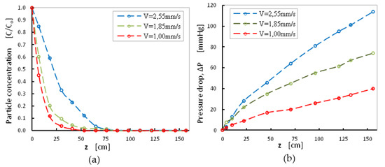 The effect of initial superficial velocity was investigated for three values of V = 1.0, 1.85 and 2.55 mm s−1 at a moderate initial turbidity value C0 = 70 NTU. The normalized particle concentration and the pressure drop along the filter were measured for 8 h of filtration (Figure 6). The lower normalized particle concentration was obtained for the experiment at the lowest superficial velocity (V = 1.0 mm/s), while for the higher value of V = 2.55 mm s−1 the complete removal of suspended solids was obtained after 75 mm of filter depth (Figure 6a). Pressure-drop values increased considerably after 8 h of operation and reached 120 mmHg, suggesting a cycle of backwashing every 8 h.