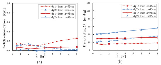 The effect of the sand-grain size distribution on filtration efficiency was investigated for two packing materials: 1.0 < dg1 < 1.4 mm and 0.6 < dg2 < 1 mm, at a moderate filtration rate, with superficial velocity, V = 1.85 mm/s and initial turbidity equal to 70 NTU. During the experiments, the normalized particle concentration and the pressure drop were measured at two different filter depths z1 = 53 cm and z2 = 98 cm, at different filtration durations (Figure 7). For larger grain size distribution, higher particle concentrations were detected in the bulk flow at z1 = 53 cm (red dashed line) and at z2 = 98 cm (red solid line). As expected at z = 98 cm, lower particle concentrations were detected compared to those shown at z = 53 cm, because a significant number of particles were deposited on the grain surfaces in the intermediate layer of 53–98 cm. The same conclusion can be derived for the second set of measurements with packing material in the range 0.6–1 mm where more particles were retained within the filter at both filter depths (blue dashed line at z = 53 cm and blue solid line at z = 98 cm). As expected, the filter with smaller grain sizes presented higher efficiency. Smaller grains are more effective due to the greater proportion of surface to volume (floc accumulation) and shorter distance between grains (bridging). On the other hand, use of grains of small size can cause greater hydraulic losses with higher pressure-drop values as Figure 7b shows. It should be noted that for both grain size distributions which were tested during the filtration of identical suspensions and for identical superficial velocity, pressure-drop values were kept lower than 60 mmHg, suggesting that both cases can be considered to be optimal conditions. Therefore, from Figure 7 it can be concluded that larger size grains allow deeper penetration and result in lower hydraulic loss. To reduce particle escape from the sand-bed, a filter with higher depth should be designed.