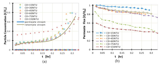 For the membrane efficiency for water treatment to be investigated, kaolinite suspensions at various values of initial turbidity (C0) (15, 30, 45, 60, 70, and 150 NTU) were prepared. During the experiments, the normalized particle concentration (C/C0) (i.e., the particle concentration at the permeate to the particle concentration at the feed stream) and the normalized permeate flux Q/Q0 (i.e., permeate flux to the corresponding flux in the case of clean water) were measured at six different input turbidities (Figure 8a). As expected, the permeate flux was reduced as a function of time for higher initial turbidity values (Figure 8b). Membrane performance decreased as the initial value of turbidity increased.