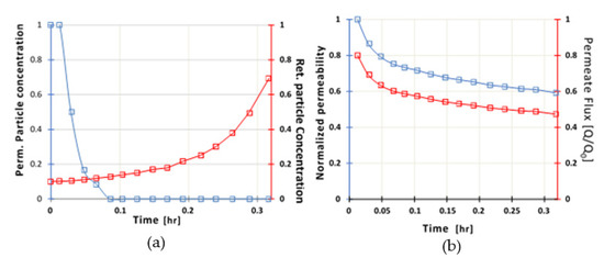 (a) Normalized particle concentration in the permeate (blue line) and in the retentate (red line) streams (b) Normalized Permeability (blue line) and normalized permeate flux (red line), as a function of filtration time for C0 = 70NTU.