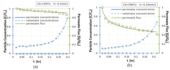 (a) Normalized particle concentration in the permeate (blue line) and in the retentate (dotted blue line) streams, normalized permeability flux (green line) for C0 = 15Ntu and V = 0.22 m/s, (b) Normalized particle concentration at the permeate (blue line) and at the retentate streams (dotted blue line) and corresponding normalized permeate flux (green line), as functions of time for C0 = 70NTU and V = 0.19 m/s.