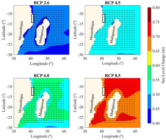 Sea-level change (m) around the Mozambican coast during 2081–2100 for each RCP scenario relative to 1980–2005. The black dots represent the grid points considered to compute the local mean.