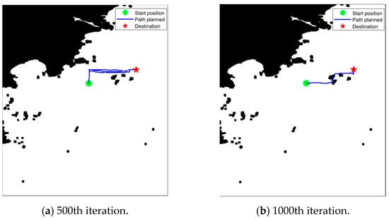 As shown in Figure 8a, in the initial 500 iterations, although the planned path finally reached the target point, there were more turn back paths. This is because the DRL algorithm in training is through constant trial and error behavior, so as to find the optimal solution, so there will be more trial and error behavior in the early stage of training. On the other hand, ships constantly exploring in the early stage, which cannot accurately judge the obstacles and target areas in the environment, and there are many exploration behaviors when facing obstacles. Therefore, it can be seen from the figure that there are many turn back phenomena in the path planned by the model. Figure 8b shows the prediction result after 1000 iterations. The model gradually plans the path with less redundant paths and reaches the target point. However, the planned path passes through some obstacles and collides with obstacles many times in the process, which obviously does not meet the requirements of the ship safety regulations. Figure 8c shows the prediction result after 2000 iterations. After continuous self-learning, the predicted path is guaranteed in terms of safety, and the collision phenomenon is gradually reduced, and finally it reaches the target position successfully. However, the planned path still fluctuates greatly, and the corner angle is too large to meet the actual navigation requirements. Figure 8d shows the result after 3000 iterations. The ship does not pass through the obstacles and successfully avoids all obstacles, and finally reaches the target point. At this time, the planned path fluctuation is weak, and gradually tends to be stable. This is because the random exploration rate of action space is reserved, so there is slight fluctuation in the whole path.