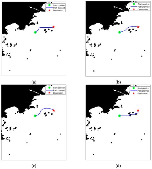 By comparing the above algorithm with the path planned in this paper (Figure 8d). The path planned by the proposed algorithm is smoother, has less path corners, and keeps a certain safe distance from obstacles, which is more in line with the actual navigation specifications of ships.