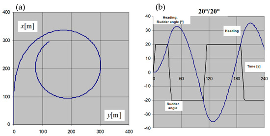 Therefore, the model represents the average ship with the average parameters for typical Baltic Sea general cargo vessel of L = 133 m, B = 20 m and T = 7.9 m. The model was created on the base of several available sea trials of similar ships which results was averaged and used for fitting the hydrodynamic coefficients. The selected model sea trials i.e., turning circle and 20°-20° Zig-Zag manoeuvre are presented in Figure 3.