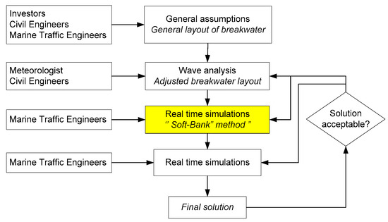 The major change in the typical method used for designing the breakwater and port entrance in contrary to already existing methods [3,4,5,38] is the use of the so-called “Soft-Bank” method (Figure 6). This methodology is as follows: