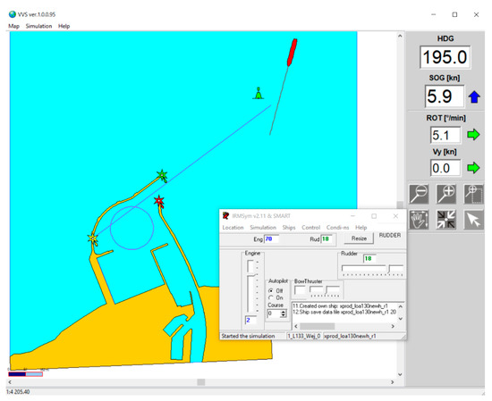 The modular approach applied here for the ship manoeuvring simulator is presented in Figure 7. The graphical interface of the model is based on 2D display similar to the nautical chart (Figure 8). The interface includes also the data of ships basic parameters (position, course, speed, rotational speed, etc.), mooring pier and coastline location, navigational markings, soundings, external conditions information, tug steering interface, and line controller, and other control elements of the model. The model is implemented in Object Pascal with the use of Delphi™ environment and Visual C™ with the use of C++ language. Limiting to the usual 3DOFs (the horizontal planar motion) or in some application 4DOFs when the squat is included. The ship movement over the ground (thus the so-called dynamic effect of the water current is introduced) is given by Artyszuk [41]. The crucial element in modelling is the verification of the ship’s hydrodynamic model [42]. Usually, the verification process is made until 10% or smaller error between model and real ship data in the selected trials like turning trial, zig-zag, and stopping—acceleration is achieved [39].