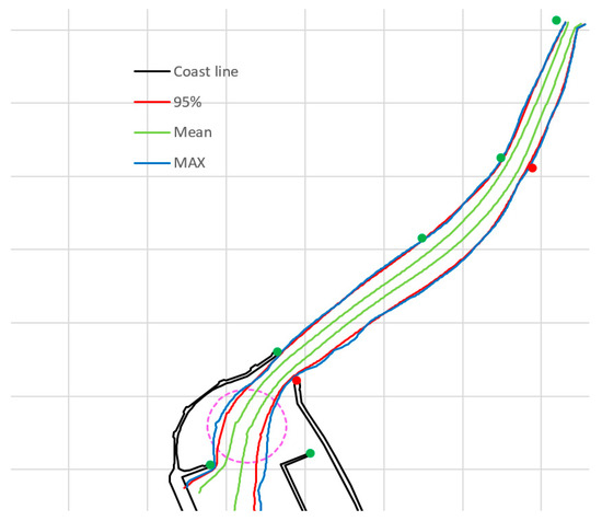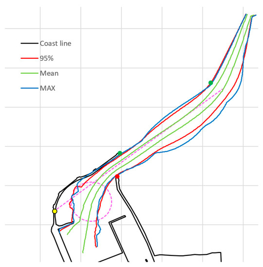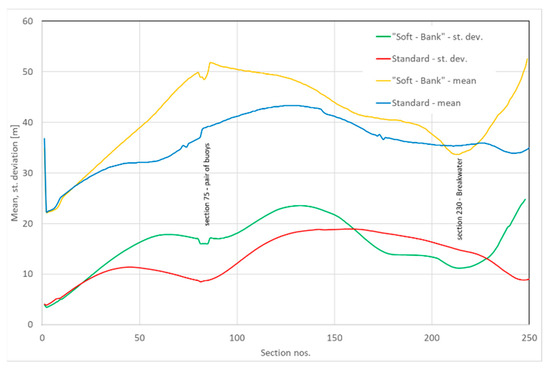 The basic statistical parameters of the manoeuvring area namely: mean and standard deviation are presented in Figure 14 for the designed approach waterway. The number of sections is 250 and the section width is 5 m. It can be observed that the mean and standard deviation is significantly lower for the standard method in comparison to the “Soft-Bank” method. It is because of the design, after the first step, navigational marking limits the waterway. Moreover, some changes in the waterway layout have been made so the movement of the ship on the approach is more optimized. The green buoy on the approach in “Soft-Bank” method (Figure 12) has been removed and the final layout of navigational marking is proposed (Figure 13) that consists of the gate of red-green buoys and two green buoys marking the starboard side of approach waterway. Such a design of waterways together with the navigational marking need an experienced marine traffic engineer engaged in the process.