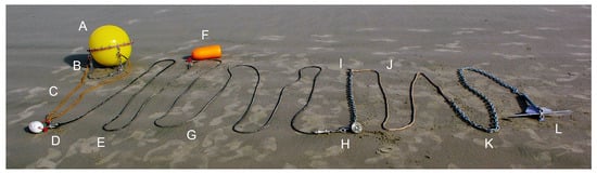 The wave measurement buoy and anchor line developed for the research project are shown laid out on Agate Beach. (A) buoy, (B) damping chain, (C) bridle, (D) bridle float, (E) rubber cord, (F) surface float, (G) rubber cord, (H) sinker, (I) chain, (J) nylon line, (K) anchor chain, (L) drag anchor.
