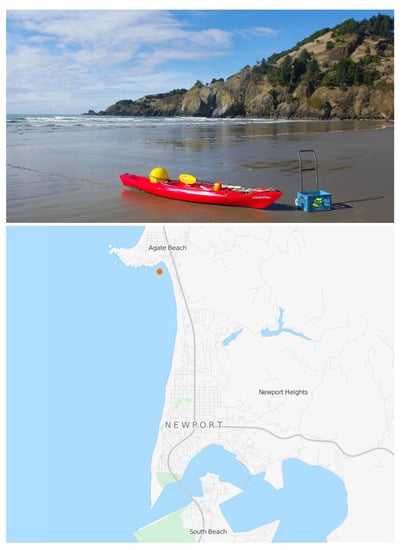 (Top) The buoy is tied down in the kayak prior to deployment with Yaquina Head in the background. (Bottom) The approximate deployment location off Agate Beach, OR is marked with an orange dot.