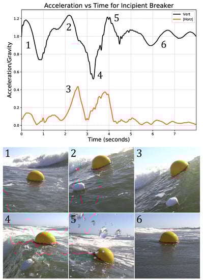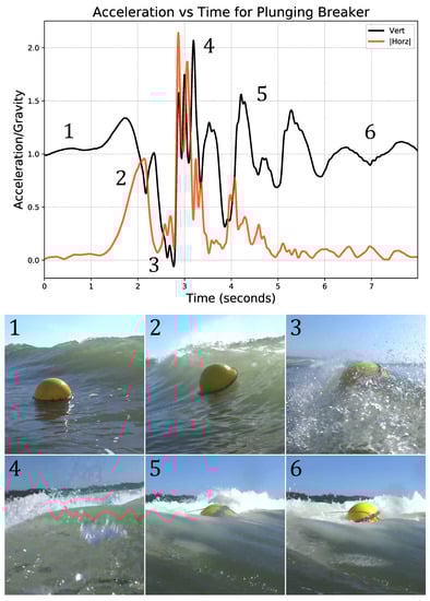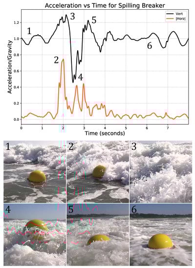 A sequence of screen captures from the video of a spilling wave impact is shown below a plot of the induced buoy accelerations. The buoy is shown: (1) free floating before impact, (2) during the initial impact of the spilling breaker, (3) as it is over-topped and submerged by the spilling wave, (4) rising vertically out of the spilling wash, (5) falling back into the stabilizing rear face of the wave, and (6) regaining stability. Wave recorded on 10 April 2014 at 16:21:06 PDT.