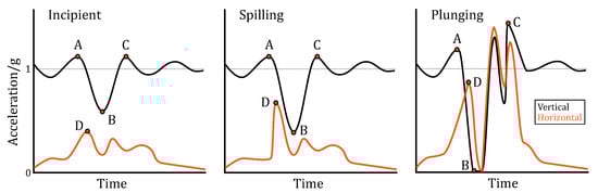 Approximate representations of the acceleration signature produced by incipient, spilling, and plunging breakers. Four points were used to quantify the acceleration magnitudes generated by the different breaker types. Point A is the maximum vertical heave acceleration generated as the wave approaches, while point B is the minimum vertical acceleration reached as the buoy reaches the wave crest. Point C, in the case of incipient and spilling waves, is the maximum vertical acceleration of the buoy as it falls back into the wash behind the wave, or in the case of plunging, lands in the water forward of the wave and tumbles in the barrel. Point D is the maximum horizontal acceleration generated by the initial impact of the wave.