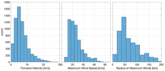 Histograms of (left) forward velocity, (center) maximum sustained wind speed, and (right) radius of maximum winds.