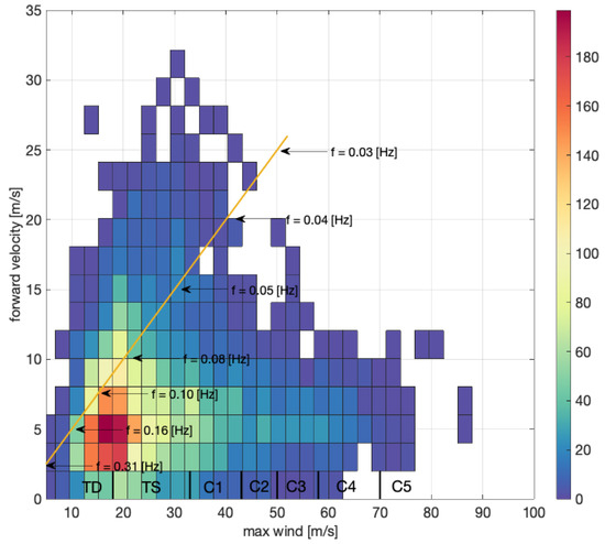 The joint distribution of maximum sustained winds and forward velocity; the counts are shown in the color scale. Additionally indicated are the S-S categories on the x-axis with black lines. An orange line shows the wave phase speed (celerity) that corresponds to wind speed on the x-axis and the wave group speed that corresponds to the translation velocity. A few frequencies in the wind-wave band are indicated along the line.