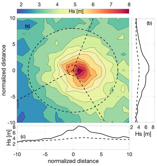 In Figure 3, the average observed wave height is viewed in the TC-centered reference frame. The small circle represents the approximate location of the eye wall, , the larger circle is eight times this distance, , and the straight dashed lines break up the TC into 3 sectors: back, left, and right. Here, data have been restricted to storms with m/s. The wave heights are asymmetric with the highest wave heights in the right sector around . The left to right asymmetry is pronounced, at , there is a ∼1.5 m difference between the wave height in the right and left sectors along the transect (Figure 3c). There is also a less pronounced front-to-back symmetry, with higher waves on average in the back hemisphere (Figure 3c).