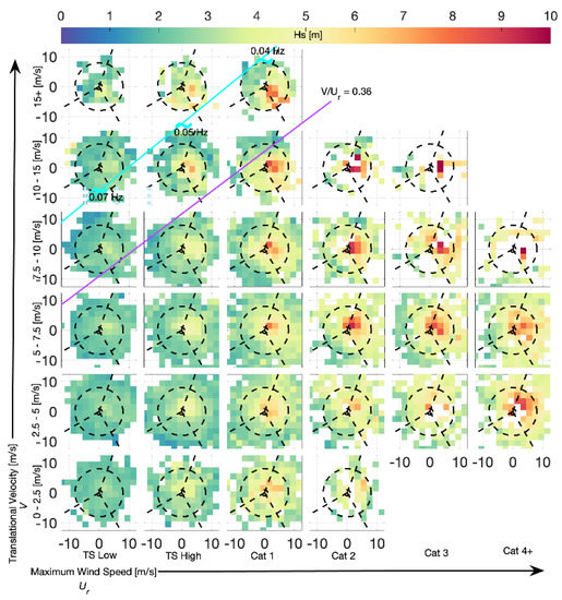 The wind field of a TC has a structure that can be parameterized in terms of a number of measurable variables, such as V and (e.g., [10,11]). Because of this predictable structure, it is valid to visualize the observations from different storms as a composite. However, this ignores secondary structures within storms, such as eyewall replacement cycles and the concentration of high winds into bands and squalls; these secondary features have been found to affect wave generation [24].