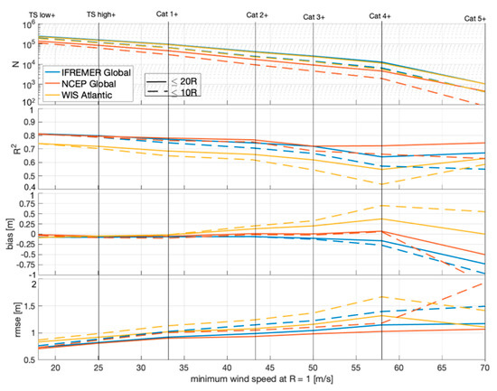 Compared to the figures quoted above, even for the most inclusive statistics during LPSs (solid lines on left side of Figure 5), there is decreased , decreased (from positive to negative overall), and increased . Below TC level, hindcast results are similar between IFREMER and NCEP, WIS has decreased and increased . As the wind speed requirement increases, the amount of data compared decreases exponentially and statistics tend to degrade. tends to decrease while tends to increase, and a spread between hindcasts becomes evident. For comparisons that include data lower than Cat 1 wind speeds, all models have a negative bias. For Ifremer, the negative bias stays negative, decreasing to −0.10 m and −0.16 m for Cat 3+ and Cat 4+ storms. For NCEP bias is closest to 0 m, going positive for Cat 2+ and maxing out a 0.07 m for Cat 4+ storms. WIS starts the lowest, −0.08 m for TS low+, but ends up with the highest bias of 0.38 m for Cat 4+. Limiting the comparison to data closer to the center of the LPSs (from 20R to 10R) tends to exacerbate the errors.