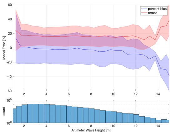 Figure 6 shows percentage bias and nrmse binned by observed wave height, bin averages and standard deviations are shown with solid lines and shaded regions, respectively. The lower plot is a histogram indicating the number of observations in each bin. Except for the first bin, on average, the percent bias is near zero, but decays steadily as a function of wave height, until about of 13 m, where it falls more precipitously (also where the number of samples is greatly reduced). The nrmse stays near ∼16% across the wave height bins until 13 m, where it increases drastically. Even discounting the accuracy of observed wave heights above 13 m, there is a clear tendency for underestimation by the model to increase as the observed wave heights increase.