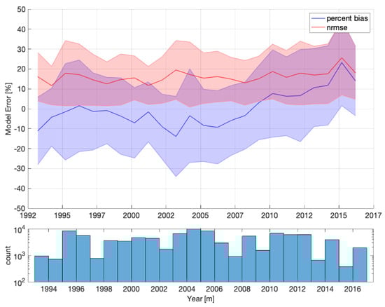 Given the time period over which data are available, there is an opportunity to explore error metrics over time. Figure 7 is similar to Figure 6 with error binned over time. The nrmse vacillates around 15% over time, with the exception of 2015 where it goes above 20% (likely related to a slow TC season with relatively few storms to sample). While variation of percent bias shows that there is both under and over estimation every year, on average, percent bias shows model underestimation for years 1992–2008, and overestimation from 2008–2016 maxing out at 20% positive bias in 2015.