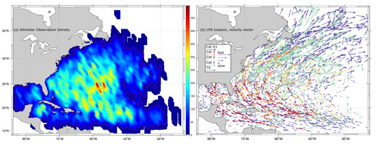 Figure 8a shows the number of observations per bin. There is a high concentration of observations in the geographic area where TC tracks often re-occur. There is a decrease in observation density near coasts because there is a corresponding decrease in data quality, and thus a decrease in passable observations. The areas of high obsveration density are consistent with typical TC pathways: easterly waves propagate off the west coast of Africa and develop into TCs in the low latitudes (10–20° N) [3]. A TC can track through the Caribbean and into the Gulf of Mexico or begin to gently curve north. If they curve towards the north, they eventually transition to a mid-latitude or extra-tropical cyclone, usually in the vicinity of 30–60° N [3]. A TC either makes landfall and dissipates or remains offshore and begins to propagate further north or northwest. This is backed up by Figure 8b that shows the location and velocity vector for each LPS considered with intensity indicated with color.