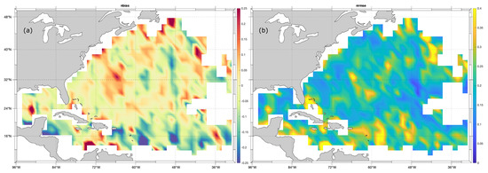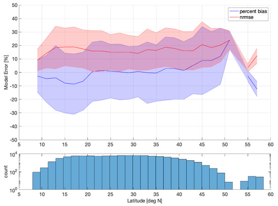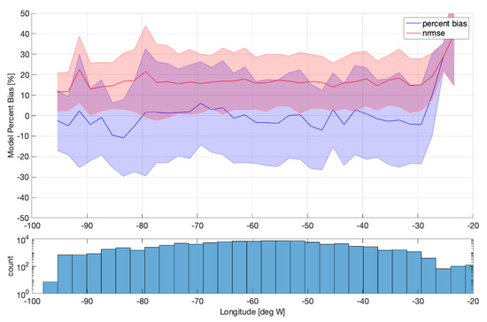 Figure 9 shows relative bias and nrmse on a geographic map. There is a strong signal of underestimation in the low latitudes (and correspondingly high rnmse). This is the typical pathway of very intense and compact storms that move relatively slow through the region (see Figure 8b. In general, the map margins seem to be areas of higher highs and lower lows for relative bias, and higher nrmse, all of these corresponding to areas with relatively fewer observations. A notable exception to this is a region of over estimation around 33° N, 70° W, within an area where observations are relatively plentiful (as indicated by Figure 8a). This high relative bias is accompanied by a more localized point of high nrmse (Figure 9). There is some indication of the influence of coastal areas in the measurements, particularly with areas of high relative bias and in the Caribbean. There appears to be lower relative bias in lower latitudes, but there are no clear patterns otherwise. In particular, a pattern of increased variance in wave height has been observed in altimeter data over strong currents, including over the Gulf Stream and its extension [50]. This increased variance leads to elevated random errors for models that do not include wave–current interaction [35]. There is no indication of a Gulf Stream signal; either the resolution is too coarse or other factors dominate the error signals around TCs.