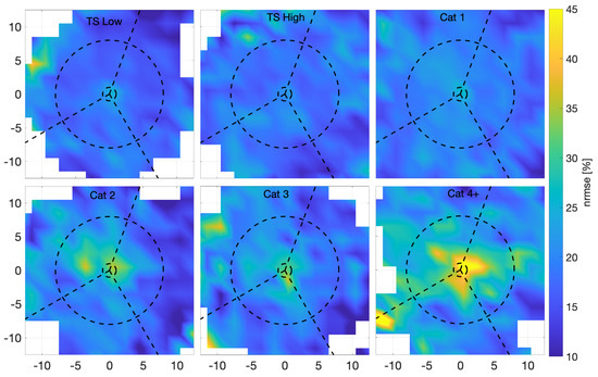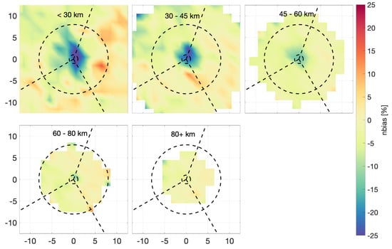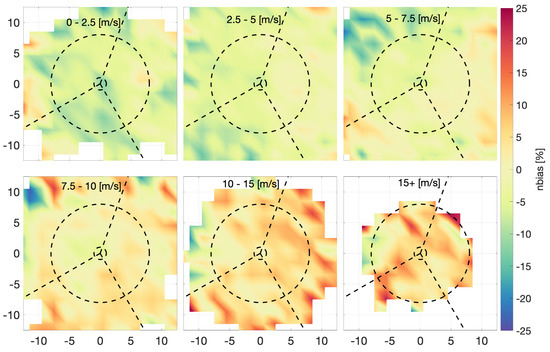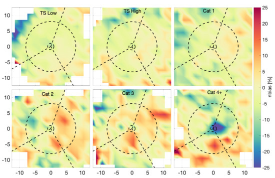 Next, we parse model-observation pairs in terms of storm attributes: maximum wind speed, translation velocity, and radius of maximum winds. First, Data were binned by intensity using the S-S hurricane intensity scale (refer to Table 1). Figure 13 shows relative bias for each intensity category. For TS Low through Cat 2 wind speeds, the patterns within are similar to those found in Figure 12a. While the pattern is barely discernible for TS Low/High, it appears to strengthen with increasing intensity. For Cat 3 wind speeds, overestimation appears in all sectors except for the region around the eye and areas in the left sector. For Cat 4+ wind speeds, there is strong underestimation (>25+%) within , mainly in the right sector peaking at −35%. Outside of , the overestimation emerges in the right and back sectors before . At this most extreme bin, generally there is an overestimation behind the eye and underestimation ahead of the eye.