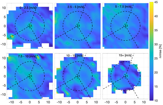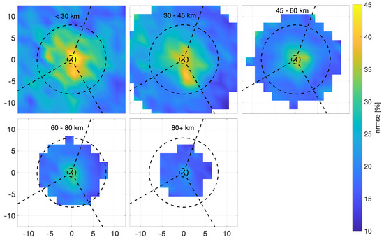 The nrmse is relatively high near the eye of the storm (30%) and decreases out radially. The right sector shows less nrmse than the left. High nrmse emerges near the margins (∼, not shown). The observation density is very high within . corresponds to the 600 samples per bin contour, but there are 100 or fewer samples per bin at the margins at 15R. Next, we parse model-observation pairs in terms of storm attributes: maximum wind speed, translation velocity, and radius of maximum winds.