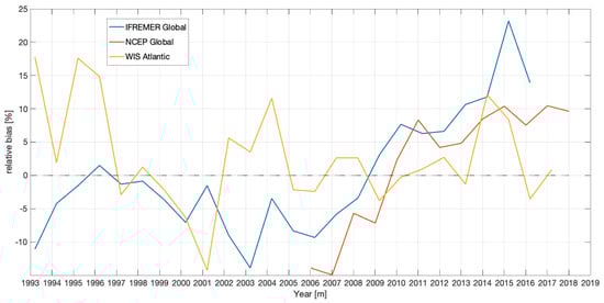 Across data sources, the pattern of error is consistent. There is also good correspondence between the patterns observed in Ifremer and NCEP, although the bias values are higher for NCEP, particularly overestimation in the right sector. Patterns from WIS (not shown) are consistent across databases, but are not consistent with those of Ifremer and NCEP. Figure A2 shows relative error metrics as a function of altimeter observed wave height. The models fare similarly for for high wave heights. The models tend to underestimate high wave heights, and this underestimation becomes worse as wave heights become higher.