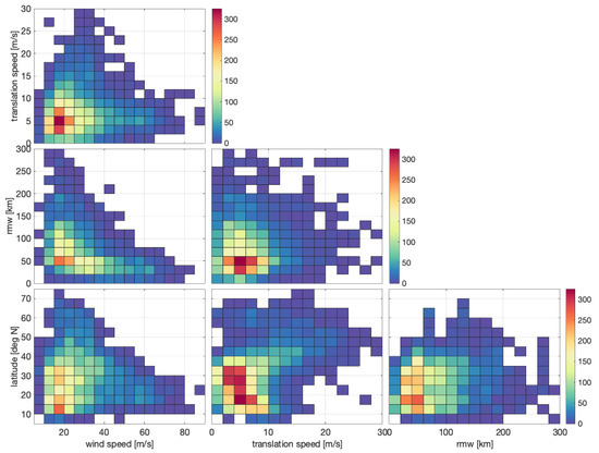 Within the TCs sampled by altimeters, there are a range of attributes. The three explored in this paper are the speed at which the storm translates through space (also referred to as forward velocity or translational velocity or forward tranlation speed), V, maximum wind speed, , and radius of maximum winds, . Of these, the primary driver of wave height is maximum wind speed. Forward velocity is important for producing dynamic fetch (e.g., [13,20]). is the key length scale and is used to normalize spatial data in the TC-centered frame of reference. Figure 1 shows the distribution of these 3 storm attributes associated with each altimeter pass (6709 passes).