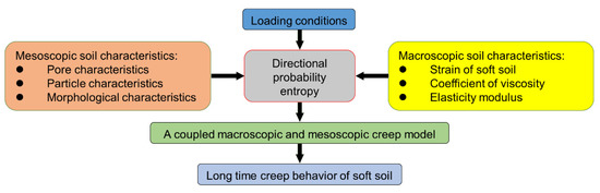 The evolution law of soft marine soil structure and stress was studied by extracting the meso-structure parameters of soft marine soil during the creep. The quantitative relationships between porosity, porosity ratio, pore distribution, directional probability entropy with pore stress distribution were also determined. A schematic diagram describing the coupled macroscopic and mesoscopic creep model for soft marine soil is shown in Figure 1.