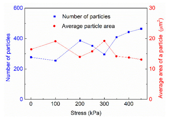 Particle characteristic parameters were extracted from the processed images. The graph of particle number and average area of particles with stress is shown in Figure 5, and was used to analyze the change in particle characteristic parameters with increasing stress.