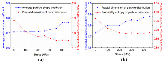 Based on the morphological parameters obtained from image processing, Figure 6a indicates the stress-dependent average particle shape coefficient and fractal dimension of pore distribution. Figure 6b indicates the fractal dimension of particle distribution and probability entropy of particle orientation under different stresses.