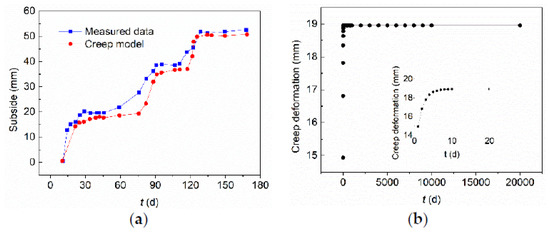 Figure 10a compares the time-dependent settlement predicted by the developed coupled macroscopic and mesoscopic creep model and measured data. The settlement data on the stratum surface at the center of the subgrade was used to validate the model. The stress of soft marine soil at the center of the subgrade is about 300 kPa under normal service conditions, which is used in Equation (14) to calculate the strain value of the creep model. The relative errors between the settlement from the creep model and the measured data are shown in Table 3. The table shows that model predictions agree with the settlement data reasonably well.