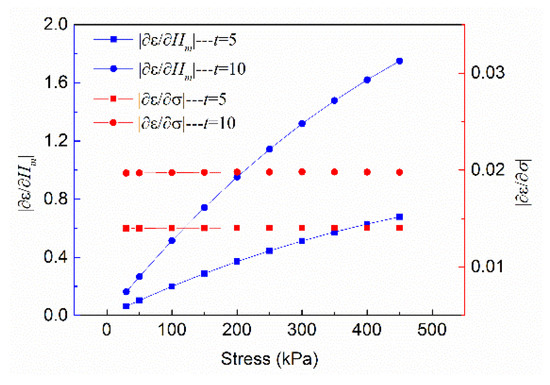 The absolute value of the partial derivative was calculated according to Equation (15), as shown in Figure 11 (the curves in the figure were calculated based on t being 5 and 10, respectively; when t takes on other values, the relationship between the curves was similar to that in Figure 11). The absolute value of is always greater than the absolute value of ; thus, it can be seen that the sensitivity of the creep model to Hm is greater than its sensitivity to σ. It can also be seen that the sensitivity of the creep model to mesoscopic parameters is greater than its sensitivity to macroscopic parameters.