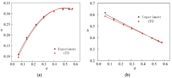 Experiment and simulation data. (a) Efficiency; (b) head ratio.