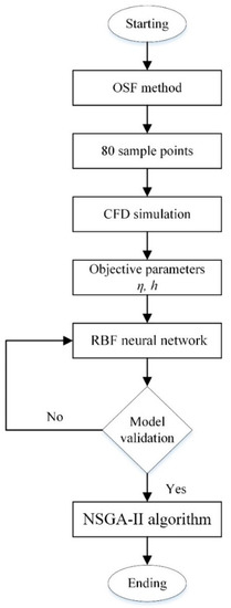 The annular jet pump optimization method proposed in this paper consists of several algorithms. A flow chart is shown in Figure 4. This method uses the optimum space filling (OSF) [35] experimental design method to get the global optimal point in the nonlinear optimization space, and adopts a non-dominated sorting genetic algorithm (NSGA-II) to optimize the local detail based on the RBF neural network model. The basic steps are as follows: