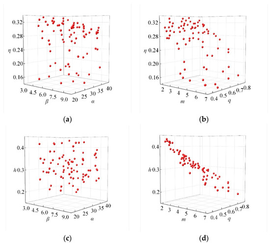 Table A1 shows the design parameters of some sample points generated by OSF, as well as the corresponding jet pump efficiency and head ratio. The number of training samples should be at least 10 times the number of input variables [29]. Together with the number of test samples, a total of 80 samples are used. Figure 7 shows the three-dimensional distribution of 80 samples. It can be seen that the design parameters of sample points are evenly distributed in the parameter space. The best sample point of efficiency is No. 52 (q = 0.4354, m = 1.84, α = 27.74°, β = 4.76°), and the corresponding jet pump efficiency is 0.332. The best sample point for head ratio is No. 27 (q = 0.3728, m = 5.292, α = 34.98° and β = 5.292°), with a corresponding jet pump head ratio of 0.4329.
