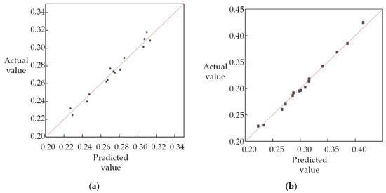 Figure 5a shows that the sampling points generated by LHS are randomly generated, and Figure 5b shows that the sampling points generated by OSF are evenly distributed. It can be seen that LHS lacks sample points in the upper right corner of the design space, which do not reflect the relationship between the factor and the response in this region. The use of OSF makes the sample points in the whole design space more uniform.
