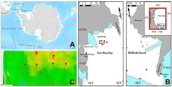 All deployments were made through the 1.5–2.5 m thick fast sea ice that covers the sea surface for 9–10 months a year, from March until January. The holes extended through the platelet ice layer, a feature unique to coastal Antarctic zones [,]. Two locations were sampled, McMurdo Sound and Terra Nova Bay (Figure 1B). The former is a long depression up to 1000 m deep extending from the Ross Ice Shelf and bordering Ross Island []. The latter is along the Victoria Land coast and is a steep seafloor consisting of granitic rock ridges and gullies filled with gravel, clay, and silt [,]. Deployments in Terra Nova Bay were performed in Silverfish Bay which, within the vast Ross Sea region MPA, also constitutes an Antarctic Specially Protected Area (ASPA 173) of the Antarctic Treaty.