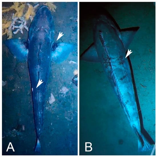 Examples of identifying marks on toothfish individuals. (A) Distinctive colour pattern of the pectoral fins and presence of a parasite on the left side of the trunk. (B) Dark spot pattern along the body.