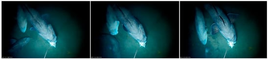 A critical point for the optimization of protocols for BRUV observations is the effectiveness of the bait in attracting the target species, which has repercussions on abundance metrics [,,]. Here, the bait was a squid routinely used in the Antarctic toothfish longline fishery. The behaviour of the fish at the bait supports a positive olfactory response and searching behaviour in the odour plume, which is expected based on their olfactory capabilities []. The fish were observed approaching slowly to the bait, often sliding it along their flank and eventually grasping it in their jaws. Dissostichus eleginoides individuals were reported to be attracted by the bait but never observed to investigate closely or attempt to take the bait []. Such distinct behaviours could be related to differences in the BRUV configurations. In particular, the essential design of our mini-BRUV was likely perceived by fish as not disturbing and did not arise suspicion on fish. However, it is also worth noting that the work on D. eleginoides was performed in a commercially longlined, plenty-of-food area, while our activity on D. mawsoni was performed in areas not accessible to fishing vessels and, in the case of Terra Nova Bay, in the frame of a specially protected area (ASPA 173) where disturbance of anthropic origin was minimal.